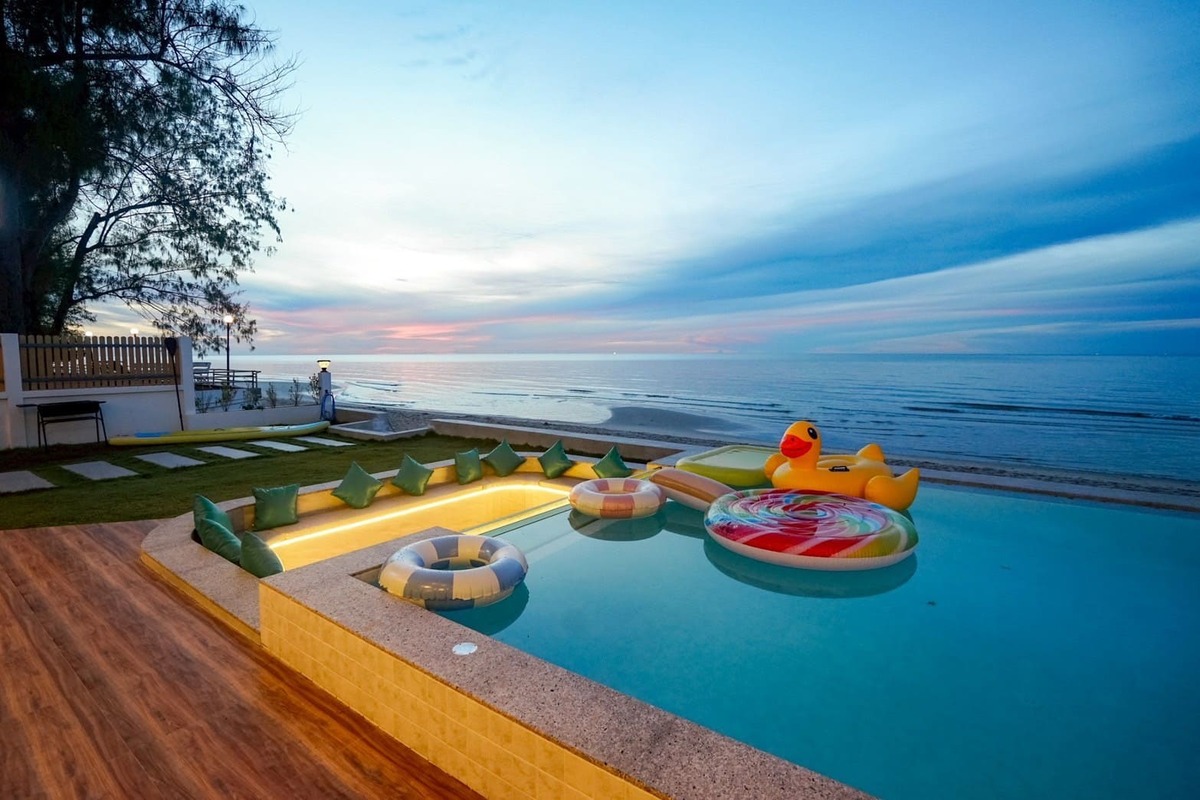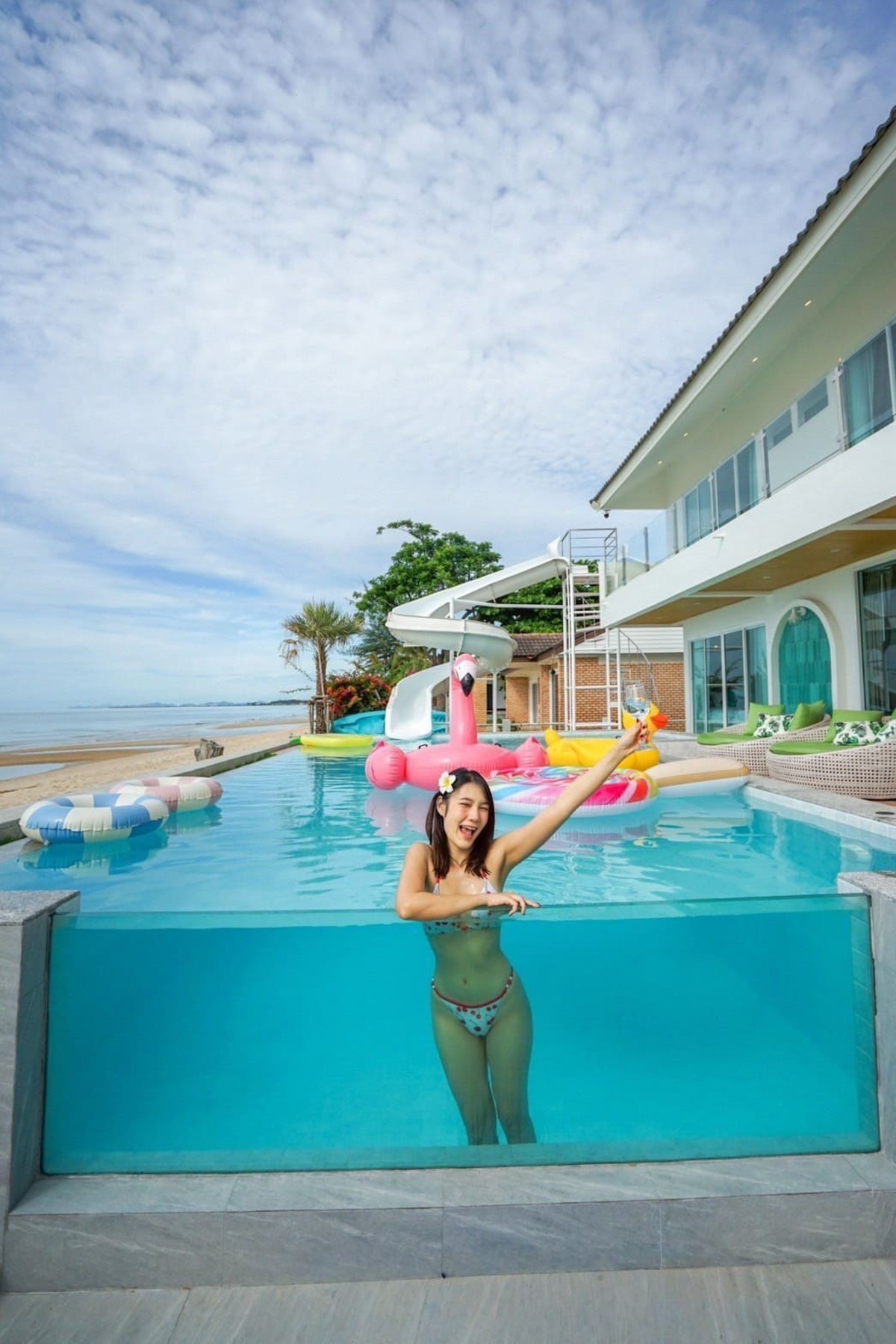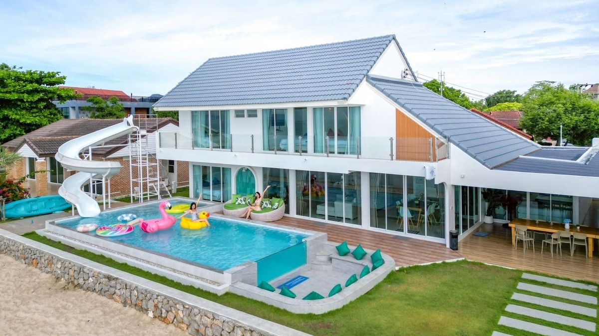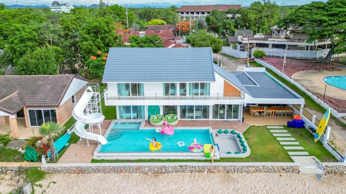 นี่คือวิลล่าติดทะเลชะอำ 7 ห้องนอน ชายหาดหน้าบ้านเป็นทรายขาว ไม่มีโขดหิน น้ำทะเลใส สามารถเล่นน้ำทะเลได้ มีกิจกรรมมากมายคอยให้บริการ แถมในบริเวณบ้านยังมีสนามหญ้าและลานกิจกรรมให้ลูกค้าได้นั่งเล่น นั่งชิลสังสรรค์กันอีกด้วย